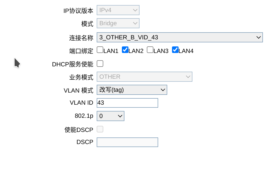 移动光猫管理后台用户名:CMCCAdmin,密码:aDm8H%MdA。进入光猫后台后,选择网络-宽带设置,连接名称处选中 3_OTHER_B_VID_43,端口绑定处多选一个网口以不影响原有机顶盒正常观看(比如选中 LAN2 LAN4)。设置完成后点击保存。