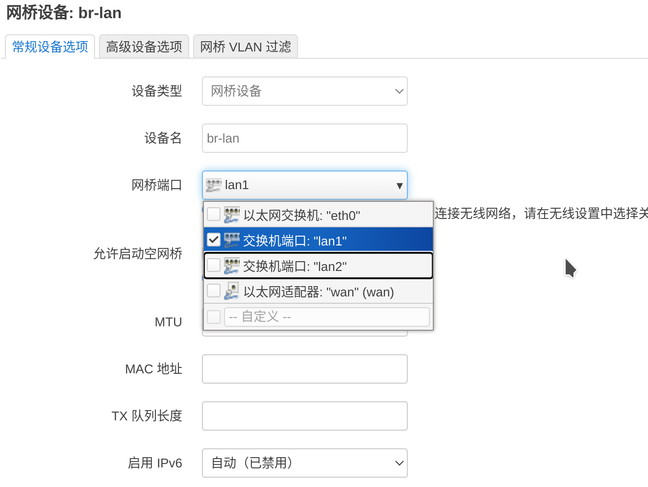在 网络-接口-设备 内选择 br-lan,点击配置,网桥端口处取消选中 LAN2,点击保存应用。