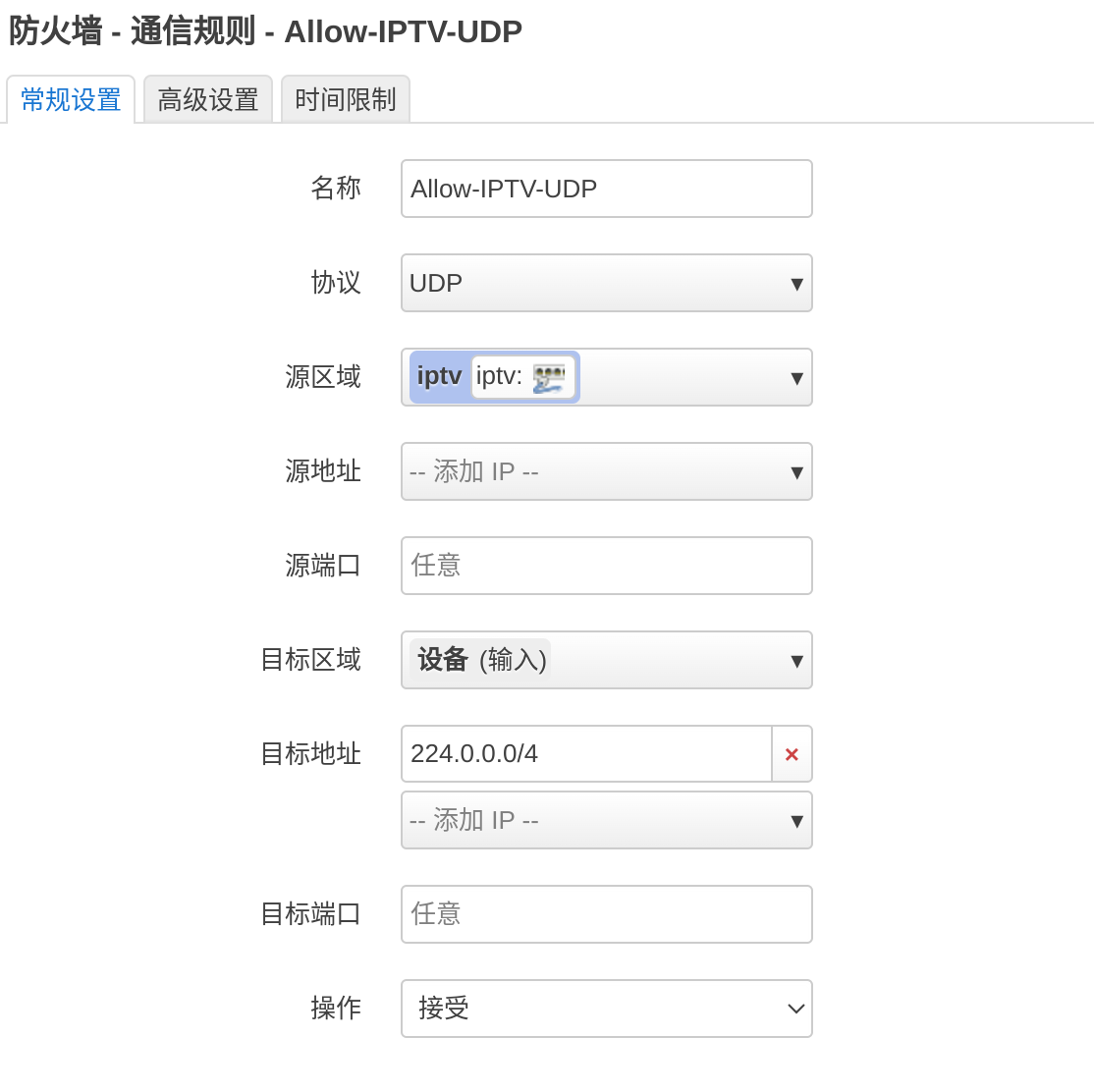 在 网络-防火墙-通信规则 内新建一条规则,名称任意,协议选择 UDP,源区域选择 IPTV,目标区域选择 设备(输入),目标地址填入 224.0.0.0/4。如下图所示。